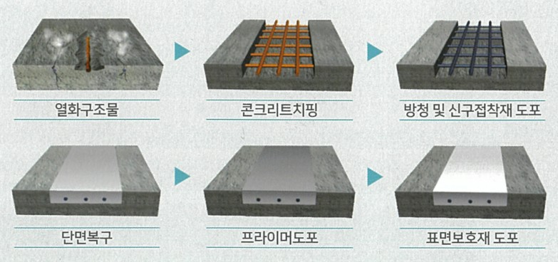 : 탄화규소(SiC) 섬유가 혼합된 고강도 폴리머 모르타르 조성물과 결속 정착 핀을 이용한 중성화방지 및 콘크리트 단면보수 보강 공법